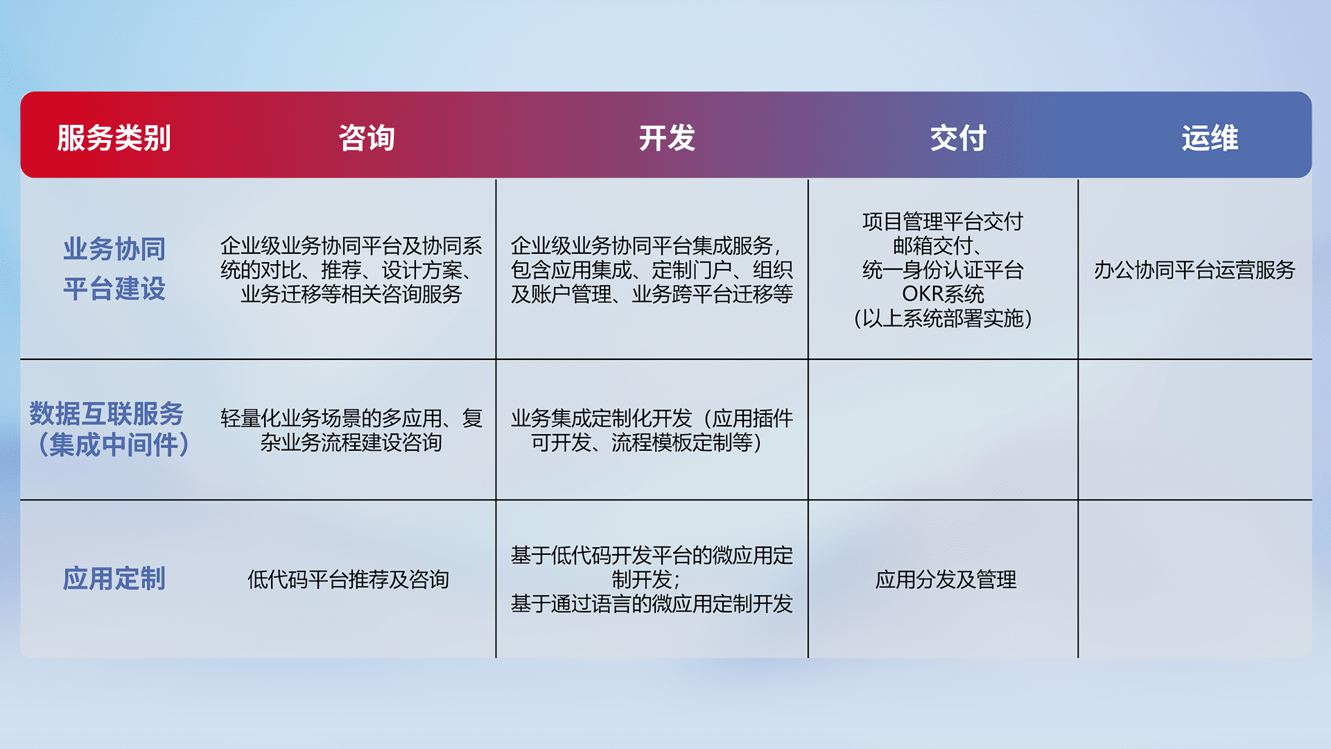 针对钉钉、、企微、、、、IDaas等平台级产品提供产品的规划、、方案、、、、交付、、定制化开发等服务,,,实现如统一协同办公、、、智能客户服务、、、、混合会议管理、、智能数据查询、、等业务场景,,实现数字化转型。。